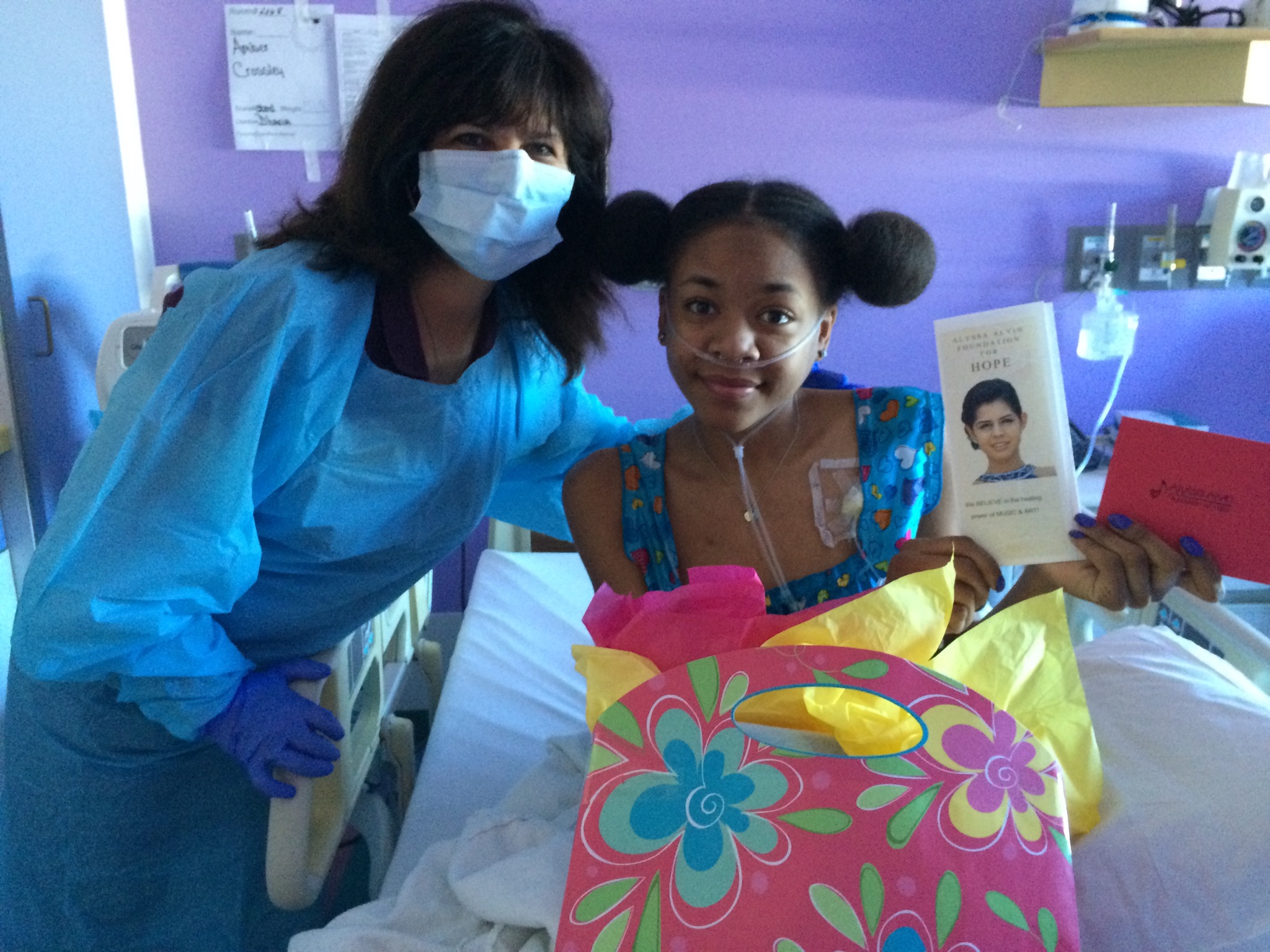 On Tuesday, June 28th, Yoli visited Amber to deliver her professional art kit and easel. Amber was alone in her room and sitting on her bed waiting for us to arrive. When Yoli presented Amber her art package, Amber asked Yoli if she could give her a hug. This was a very special moment. Amber said she was very appreciative of her art package from AAFH. Amber said, “this makes me happy!” She will now be able to do art while hospitalized with this portable easel. She was happy to take pictures with Yoli and grateful for all the art supplies - 24 acrylic paints, graphite pencils, canvas boards and looks forward to expressing herself in art!